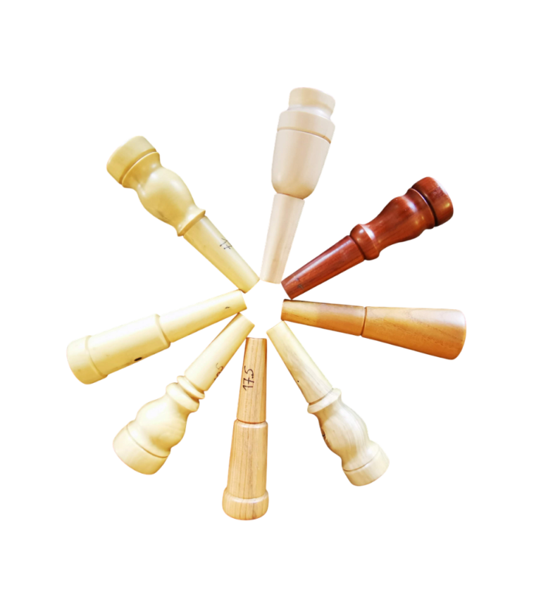 Les embouchures sont toutes des pièces uniques faites à la main, il en existe de multiples diamètres, cuvettes, pose, perce, etc. Chaque joueur doit en avoir une qui lui convient personnellement, c'est pourquoi il est préférable de l'essayer en magasin.